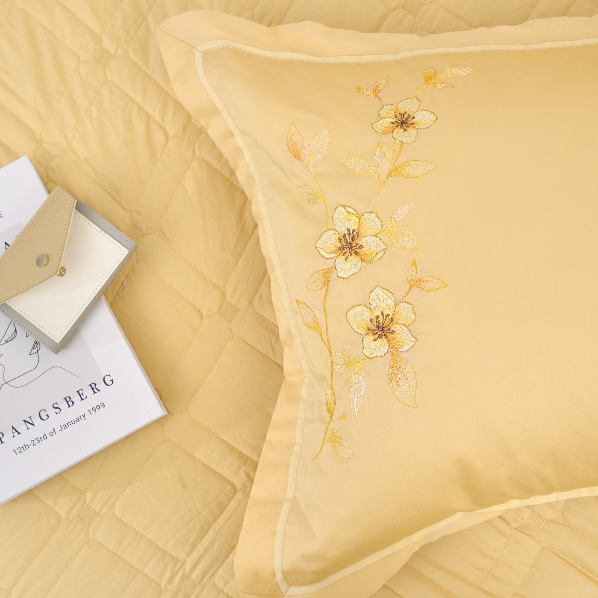 Màu vàng ấm áp tựa như ánh sáng Mặt Trời. Đem lại nguồn năng lượng tích cực đến muôn nơi. Theo phong thủy, đây là màu của niềm vui, hạnh phúc, sung túc và sự thịnh vượng. Bộ chăn gối cao cấp Sông Hồng SH_UC22 025 với tông vàng sang trọng được thêu thêm hoa văn tinh tế. Mang tới cảm giác trang trọng cho căn phòng ngủ.