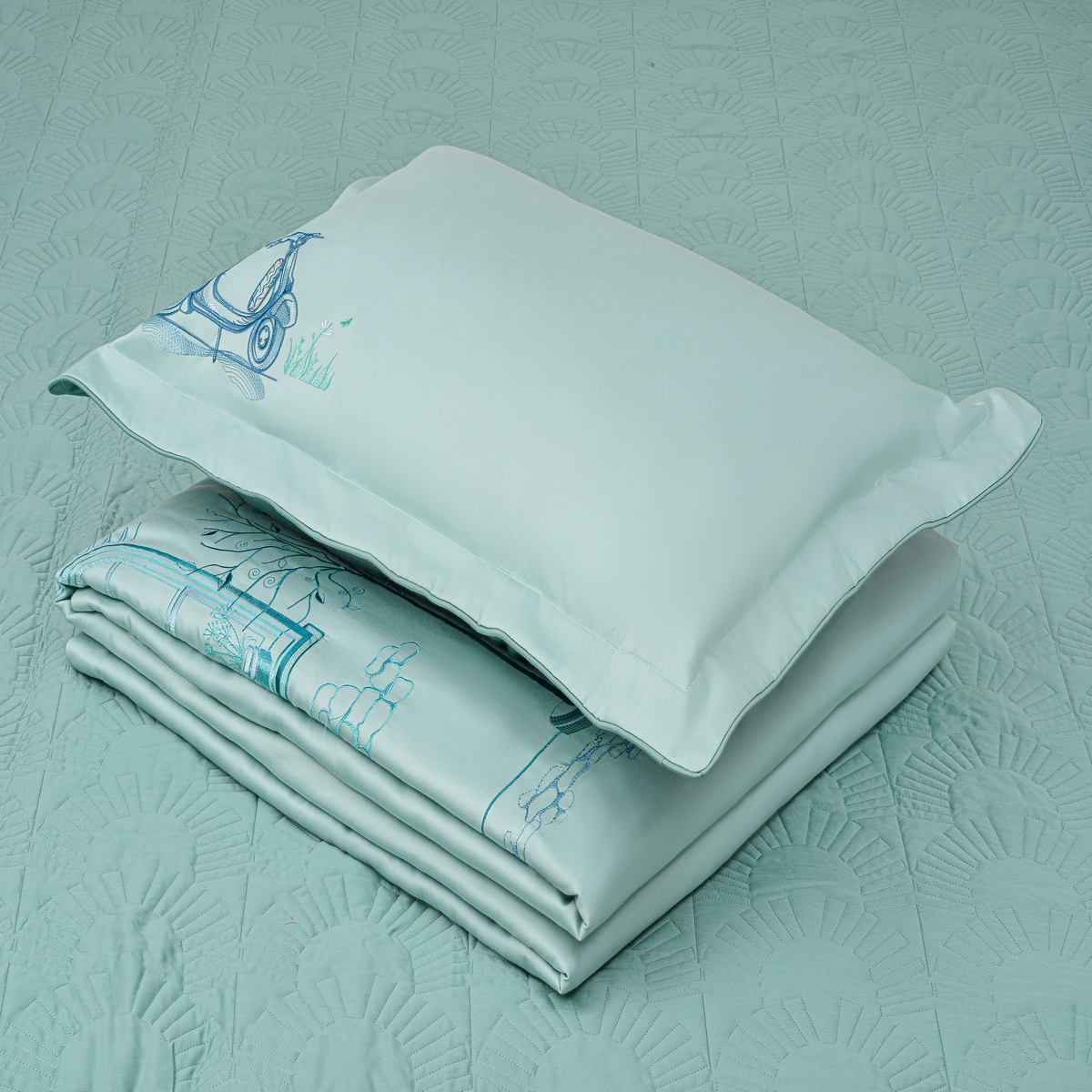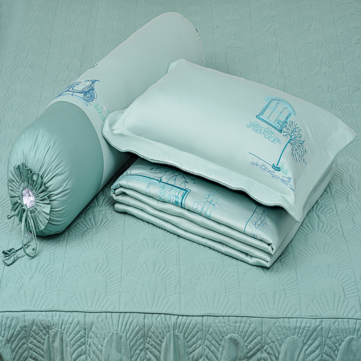 • Vỏ gối ôm 38cmx100cm trang trí họa tiết đồng bộ với chăn và ga.