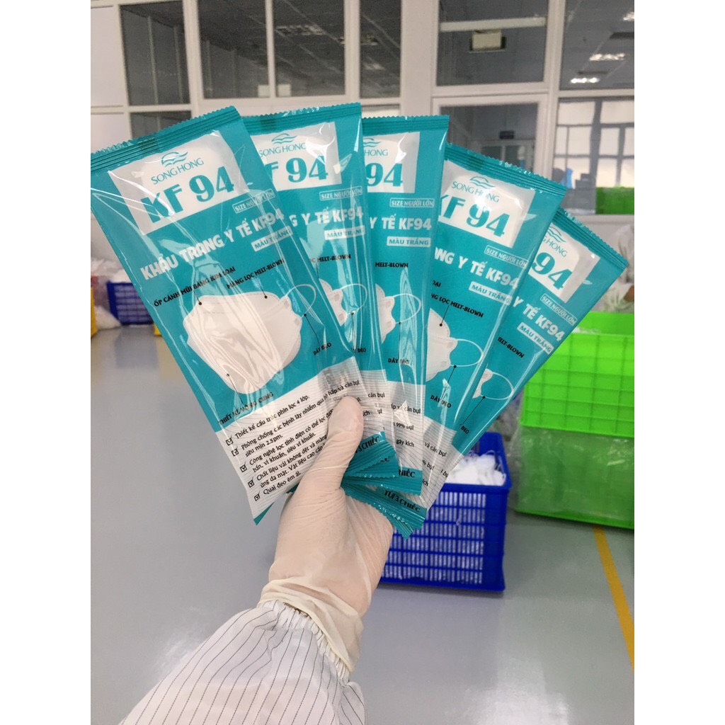 Khẩu trang y tế KF94 được sản xuất từ dây chuyền đạt chuẩn của Hàn Quốc, được làm từ chất liệu sợi giấy hoạt tính cao cấp không dệt, là chất liệu rất được ưa chuộng trong các sản phẩm y tế hiện nay nhờ khả năng hấp phụ cao, chống độc và chống bụi mịn hiệu quả. Sản phẩm khẩu trang y tế KF 94 của May Sông Hồng đạt tiêu chuẩn N95 của Cục quản lý thực phẩm và dược phẩm Hoa Kỳ, sau khi đã trải qua đầy đủ các quy trình nghiêm ngặt về kiểm tra, giám sát từ nguyên liệu sản xuất, dây chuyền sản xuất, cho tới thành phẩm.